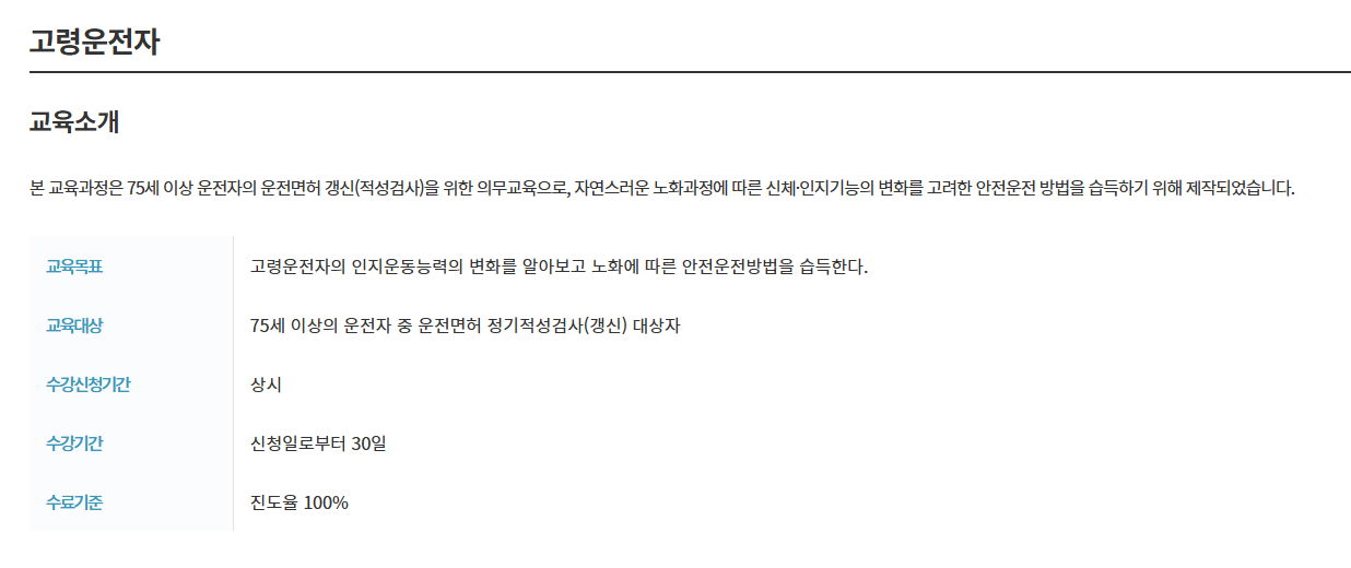 - 만 65세 이상~74세 이하 운전자는 이 교육이 권장사항으로 안내되어 있습니다.
