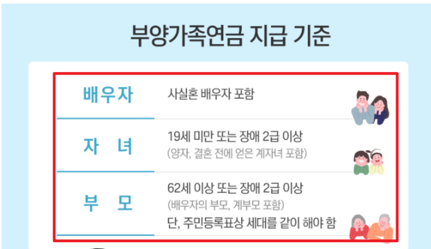 부양가족 연금을 신청하기 위해서는 아래 요건을 충족해야 합니다: