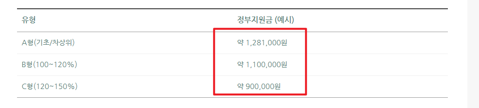 | 유형 | 서비스 기간 | 서비스 총액 | 정부지원금 | 본인부담금 |