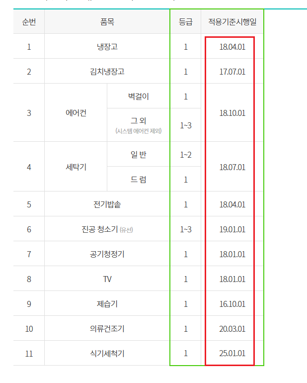 | 세탁기, 의류건조기 | 1등급 또는 고효율 등급 |