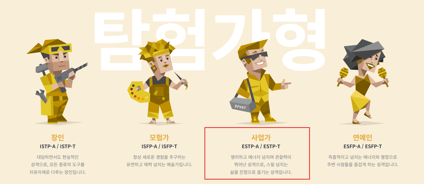 | ESTP | 사업가 | 활동적이고 현실감각 뛰어남 |