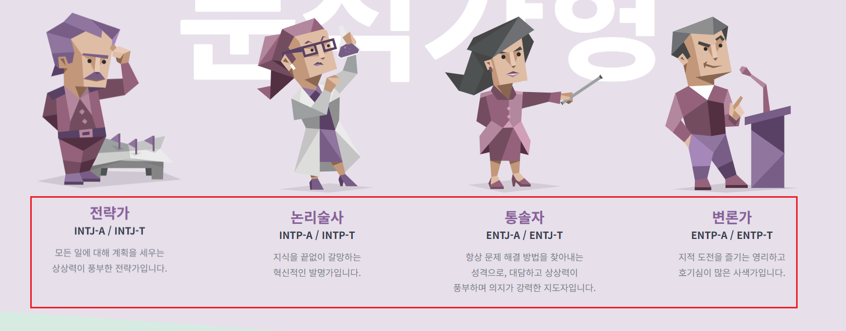 | INTP | 사색가 | 지적 호기심이 많고 분석적인 성격 |