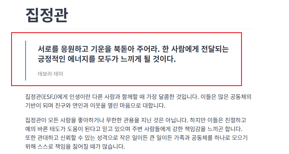 | ESFJ | 집정관 | 타인을 배려하고 조화를 중요시 |